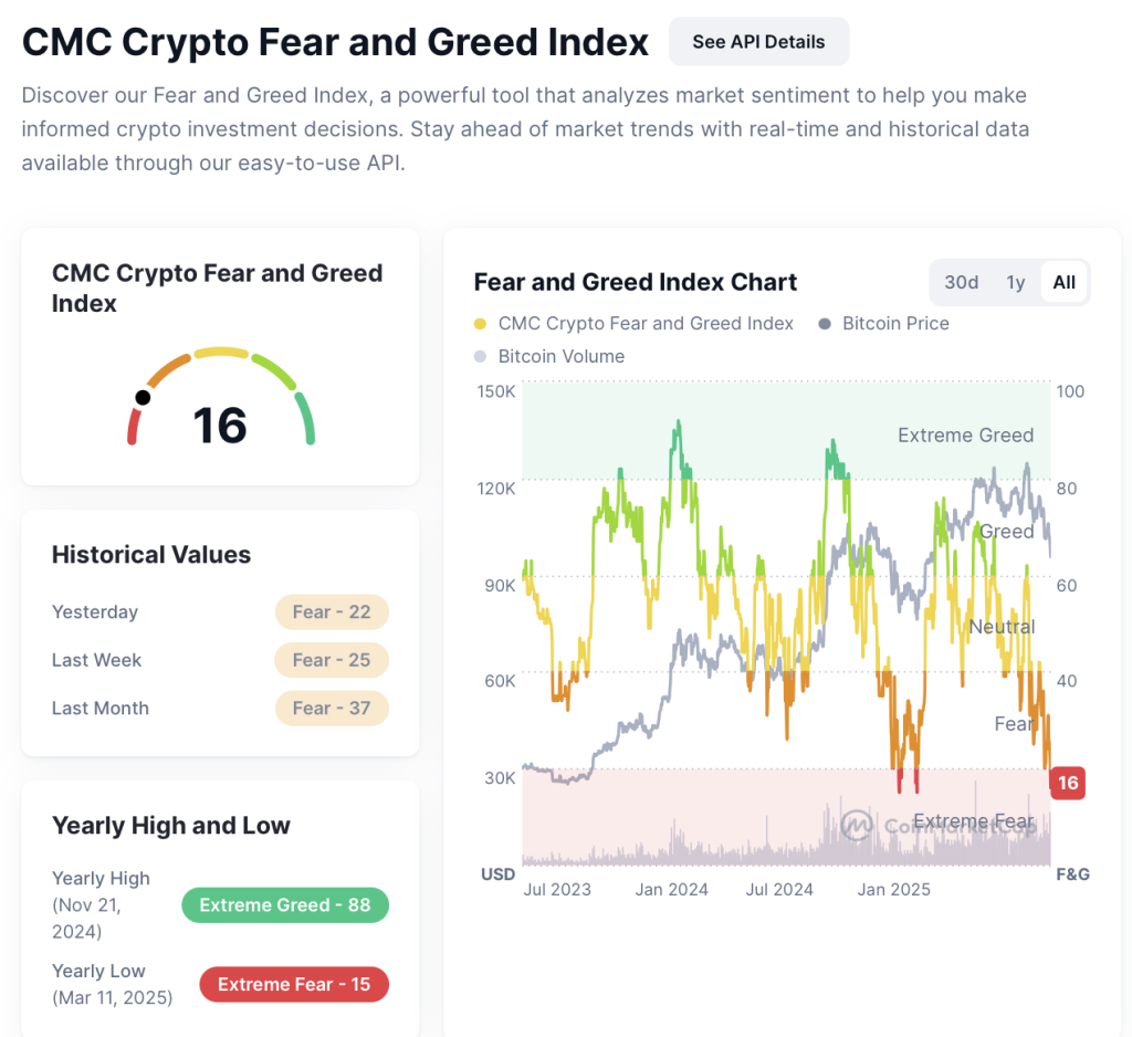 Aktuell zeigt sich ein stark eingetrübtes Bild. Der Fear and Greed Index ist auf 16 gefallen und signalisiert damit extreme Angst. Dabei handelt es sich um ein Niveau, das deutlich unter dem Wert der Vortage liegt. Erst gestern stand der Index noch bei 22, vor einer Woche bei 25 und im vergangenen Monat sogar bei 37. Diese Entwicklung zeigt eine klare Verschlechterung des Sentiments, ausgelöst durch fallende Kurse und eine sichtbare Unsicherheit im Kryptomarkt.