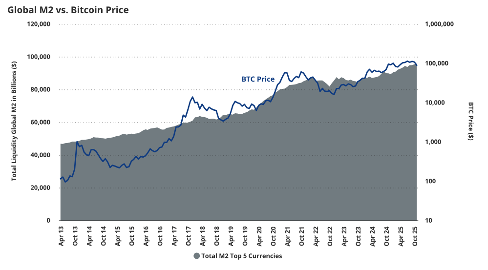 Die Analysten von VanEck argumentieren, dass das aktuelle globale Finanzsystem unter wachsenden Schulden und schwächeren Landeswährungen leidet. In solchen Phasen suchen Anleger nach nicht-staatlichen Wertspeichern, ähnlich wie Gold, und Bitcoin könnte diese Rolle langfristig ausfüllen. Historisch hat sich bereits gezeigt, dass Bitcoin stark steigt, wenn die Geldmenge weltweit zunimmt oder Staaten neue Schulden aufnehmen. Inzwischen reagiert Bitcoin jedoch deutlich weniger auf kurzfristige Schwankungen des US-Dollars und stärker auf globale wirtschaftliche Unsicherheiten.
