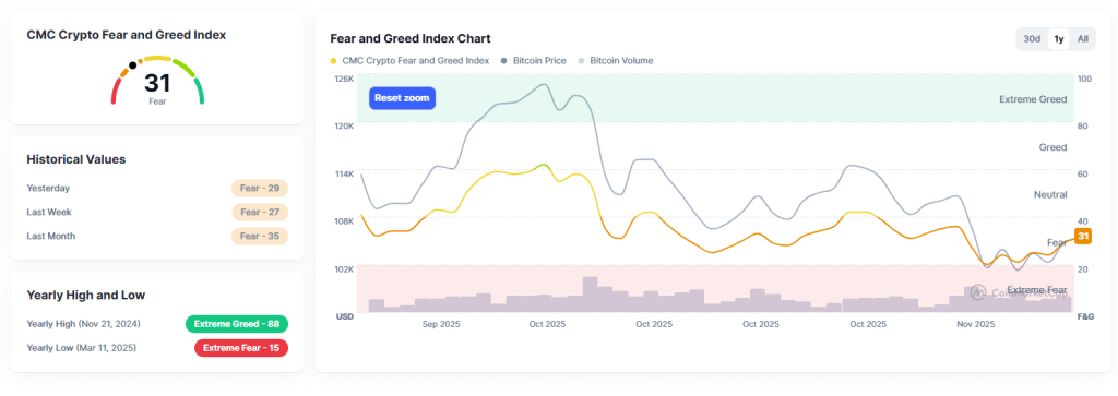 Der Markt reagiert derzeit empfindlich auf makroökonomische Unsicherheiten. Auch der Fear & Greed Index steht mit 31 Punkten klar im „Fear“-Bereich. Viele Anleger ziehen Kapital aus riskanteren Altcoins ab und parken es in Bitcoin. Diese Risikovermeidung trifft High-Beta-Projekte wie SOON besonders stark.