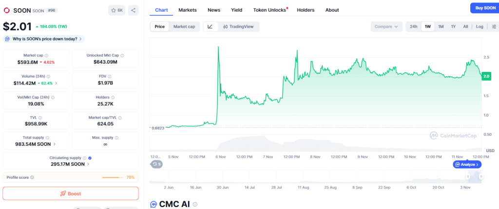 Aktuell notiert der SOON Token bei rund 2,01 US-Dollar , ein Minus von 3,13 Prozent innerhalb von 24 Stunden. Der Rückgang fällt in eine Phase allgemeiner Schwäche am Kryptomarkt, wo die Gesamtmarktkapitalisierung um 1,07 Prozent nachgab.