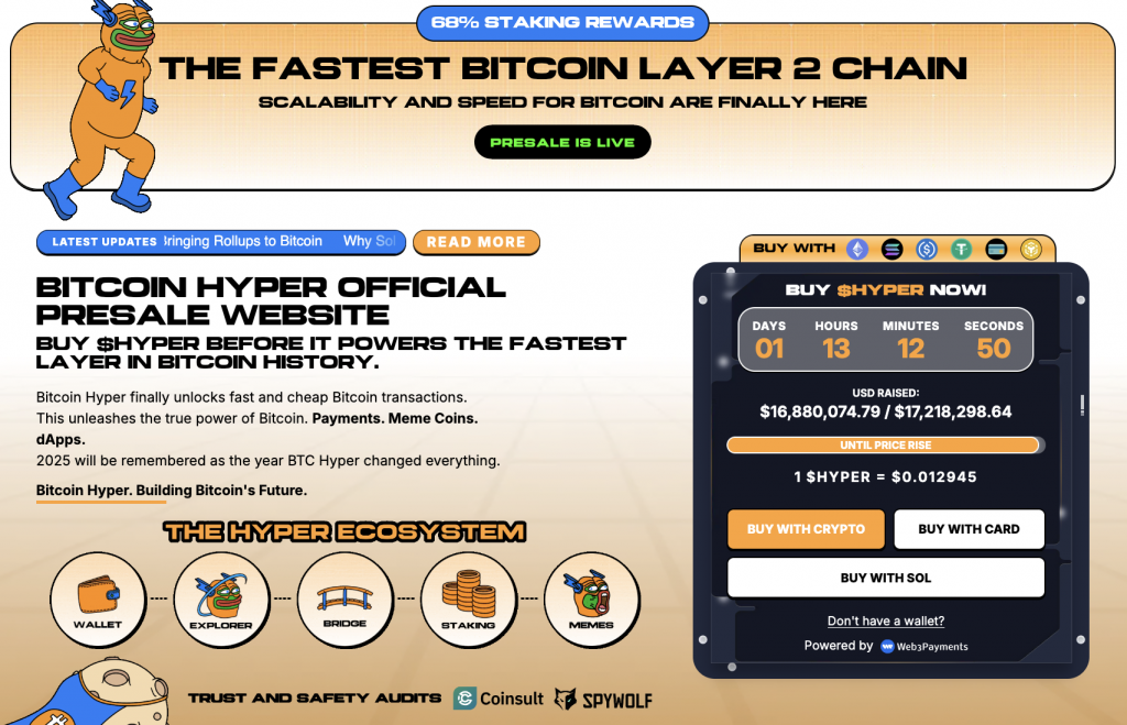Im derzeit laufenden Presale können Anleger HYPER-Tokens zu einem rabattierten Festpreis von 0,012945 $ erwerben. Das Projekt hat bereits über 16,88 Millionen Dollar an Funding gesammelt, was das starke Interesse der Investoren unterstreicht. Ein besonderer Anreiz für langfristig orientierte Anleger ist die Möglichkeit, im Presale erworbene Coins mit einer jährlichen Rendite von bis zu 68% zu staken.