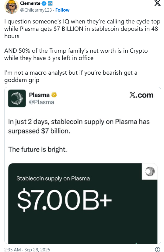 Der Krypto-Analyst Clemente widerspricht klar der Auffassung, dass sich der Kryptomarkt an einem Wendepunkt in Richtung Bärenmarkt befindet. Er verweist besonders auf Plasma, das innerhalb von nur 48 Stunden rund sieben Milliarden US-Dollar an Stablecoin-Einlagen verzeichnet hat – ein Hinweis auf massive Kapitalzufuhr und aktive Verlagerung von Liquidität in neue Krypto-Infrastrukturen.