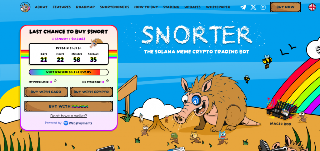 Snorter positioniert sich in dieser Nische mit einem besonderen Ansatz, indem es Telegram als direkte Schnittstelle nutzt. Das Projekt hat bereits 4,2 Millionen US-Dollar eingesammelt und bietet einen Bot, der Marktdaten verarbeiten, Orders auslösen und Strategien abbilden kann. Der SNORT-Token bildet das Fundament des Ökosystems und ermöglicht nach dem Erwerb Zugang zum Telegram-Bot sowie attraktive Staking-Renditen von rund 115 Prozent APY.