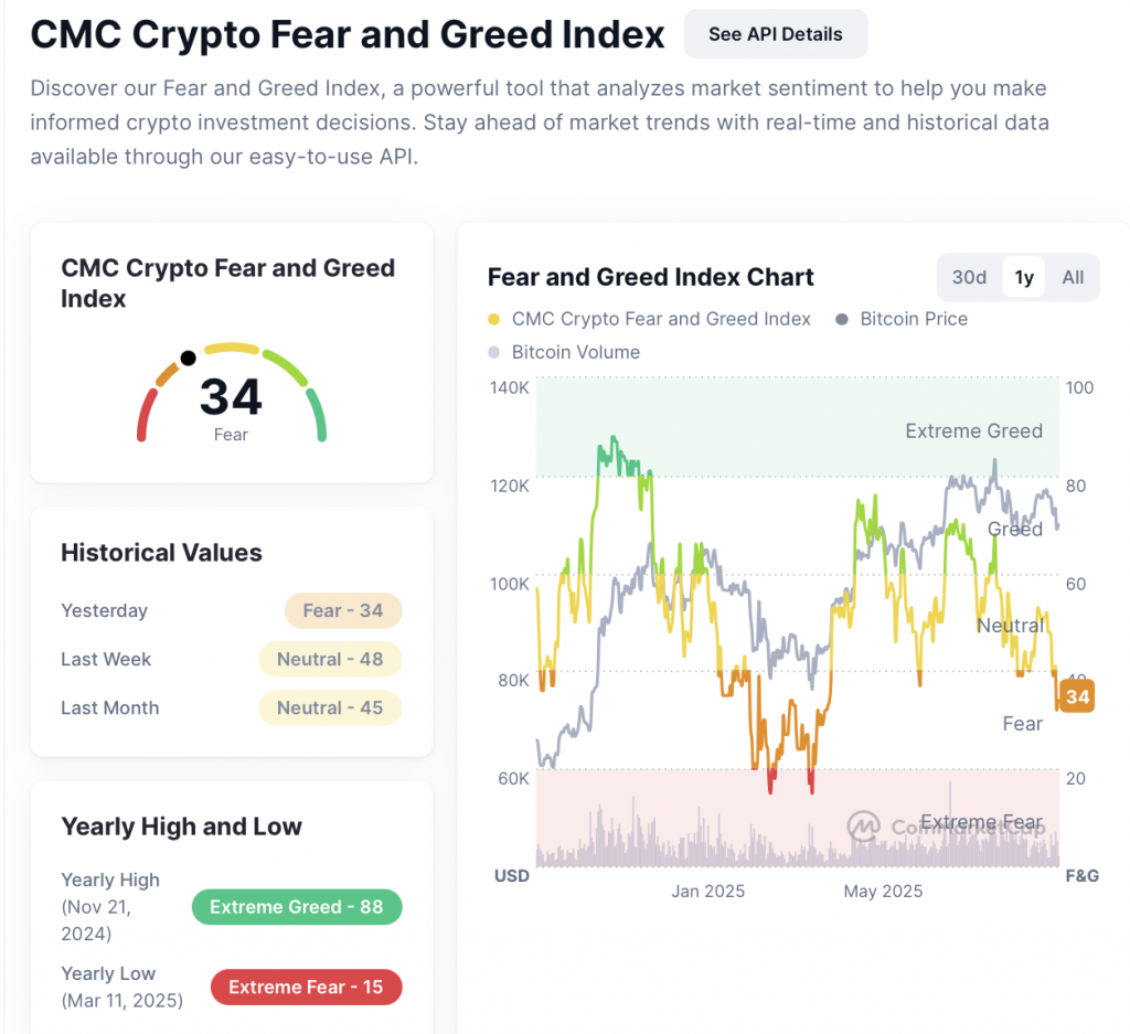 Der Bitcoin Fear and Greed Index misst die Marktstimmung anhand verschiedener Faktoren und ist aktuell auf 34 gefallen, was in den Angstbereich rutscht. Historisch betrachtet deuten solche Niveaus jedoch nicht auf ein Zyklus-Top hin, sondern signalisieren eher antizyklische Kaufchancen.