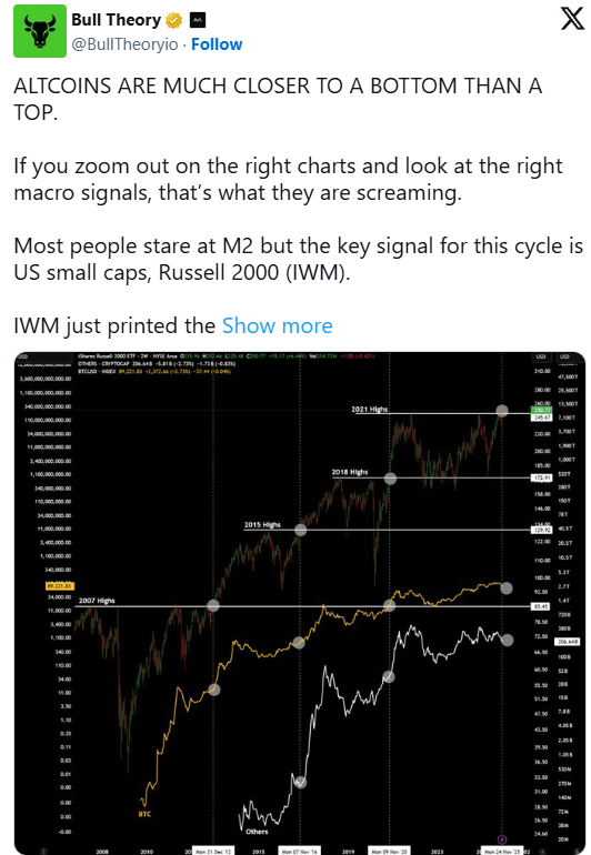 Historisch gilt genau dieses Verhalten als verlässliches Signal für eine steigende Risikobereitschaft im Markt. Wenn Small Caps neue Hochs markieren, bedeutet das in der Regel, dass Liquidität ausreichend vorhanden ist und Anleger bereit sind, wieder Risiko einzugehen. Ein Blick auf die langfristigen Charts unterstreicht diese Zusammenhänge. Immer dann, wenn der Russell 2000 wichtige horizontale Widerstände aus früheren Hochpunkten überwunden oder erfolgreich getestet hat, etwa aus den Jahren 2015, 2018 oder 2021, folgte zunächst eine Aufwärtsbewegung bei Bitcoin. Anschließend begann mit Verzögerung eine ausgeprägte Rallye bei den Altcoins.