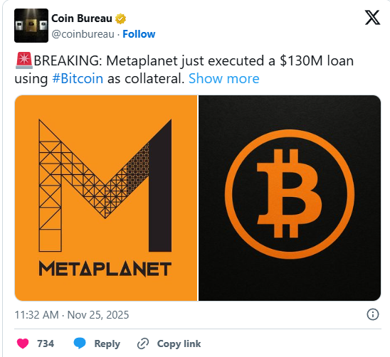 Metaplanet hat einen bedeutenden Schritt in seiner Kryptowährungsstrategie vollzogen und einen Kredit über 130 Millionen Dollar aufgenommen, der vollständig durch Bitcoin besichert ist. Diese Maßnahme unterstreicht, wie das Unternehmen Kryptowährungen sowohl als Portfolio-Asset als auch als Instrument für Finanzoperationen einsetzt. Der Kredit wurde am 21. November abgeschlossen, zu einem Zeitpunkt, als Bitcoin unter deutlichem Abwärtsdruck stand. Dies deutet darauf hin, dass sich Metaplanet strategisch positioniert hat, um vom jüngsten Kursrückgang zu profitieren und weitere Assets zu attraktiven Preisen zu erwerben.