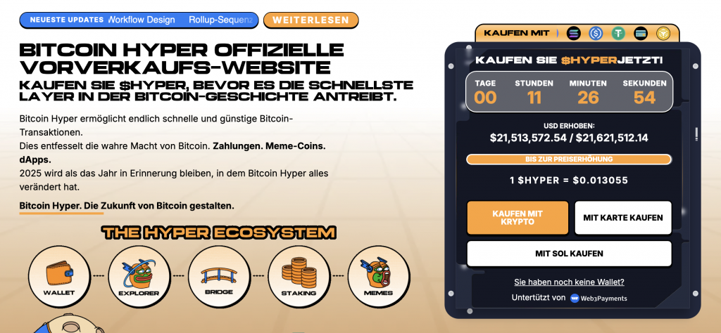 Auf der Layer 2 werden Transaktionen schneller und günstiger und es wird möglich, Bitcoin für Staking, Lending und viele weitere DeFi-Anwendungen zu nutzen. Damit würden sich auch auf Bitcoin Zinsen verdienen lassen, was bisher nicht möglich war. Investoren haben noch die Möglichkeit, von Anfang an dabei zu sein, da der $HYPER-Token aktuell noch im Vorverkauf erhältlich ist. Schon jetzt haben Anleger über 21,5 Millionen Dollar investiert, um noch vor dem Börsenlisting zum günstigen Fixpreis einzusteigen.