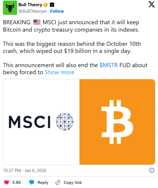 MSCI-Entscheidung sorgt für Entlastung – Kryptomarkt startet stabiler ins Jahr 2026
