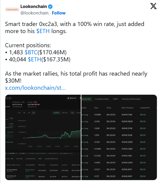 Die Offenheit der Blockchain macht es möglich, jede Transaktion in Echtzeit zu verfolgen, was besonders bei den Bewegungen von Krypto-Walen – Investoren mit enormen Kapitalmengen – für Aufmerksamkeit sorgt. Der betreffende Großinvestor ist dadurch aufgefallen, dass jeder seiner Trades im Gewinn endete, ohne dass jemals eine Position im Minus geschlossen wurde – eine in der Kryptobranche extrem seltene Erfolgsquote.