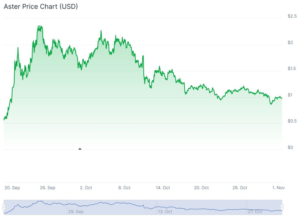 Hierbei handelt es sich um die native Kryptowährung des dahinter stehenden neuen DEX-Perpetual-Projektes Aster. Dieses will Branchengrößen wie Hyperliquid Konkurrenz machen und hatte direkt zum Start einen starken Einstieg mit hohen Transaktionsvolumen und Gebühreneinnahmen. Nach der initialen Rallye ist jedoch auch ASTER im Verlauf des Oktobers deutlich im Wert zurückgefallen. Dabei brach der Coin zuletzt auf den 1-$-Support ein und wird aktuell ziemlich genau bei der 1-$-Marke gehandelt.