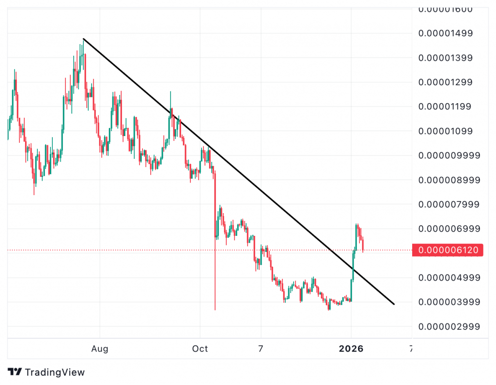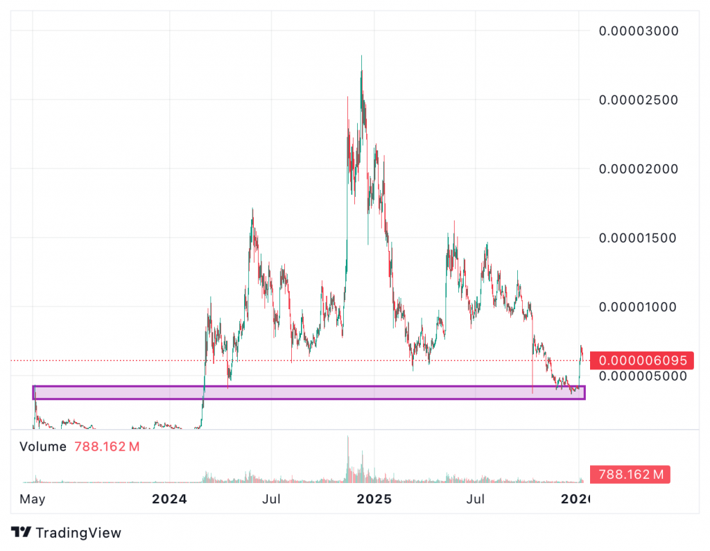 Begleitet wurde der Rebound von einem deutlichen Anstieg des Handelsvolumens, das Niveaus erreichte, die zuletzt im frühen vierten Quartal beobachtet wurden. Zusätzlich konnte auf niedrigeren Zeiteinheiten eine seit August bestehende Abwärtstrendlinie nach oben durchbrochen werden. Trotz des verbesserten Momentums notiert PEPE weiterhin unter größeren Widerstandsbereichen bei 0,000007 und 0,00001 US-Dollar.
