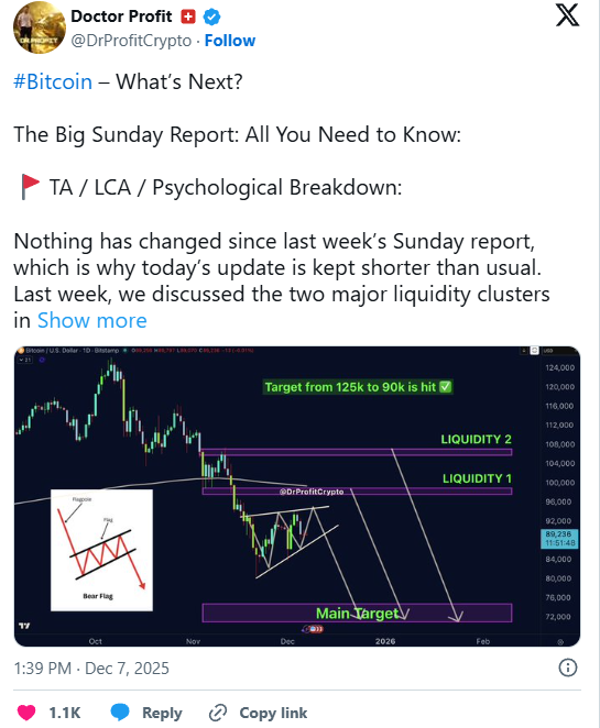 Dr. Profit ist ein Analyst, der auf X eine enorme Reichweite und über 400.000 Follower hat. Er hält an seiner klar bearishen Einschätzung für Bitcoin fest. In seinem aktuellen Marktausblick erklärt er, dass sich das technische Gesamtbild gegenüber der Vorwoche kaum verändert habe. Der zuvor erwartete Rückgang vom Hochbereich zwischen 115.000 und 125.000 Dollar sei vollständig umgesetzt worden, womit das übergeordnete Abwärtsszenario weiterhin gültig bleibe. Aus seiner Sicht befindet sich Bitcoin nach wie vor in einem Bärenmarkt, der noch lange nicht abgeschlossen ist. Er spricht sogar davon, dass diese Stimmung noch bis September 2026 anhalten könnte.