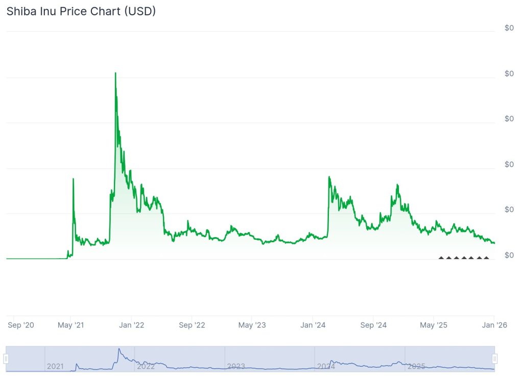 Zum Zeitpunkt der aktuellen Daten liegt SHIB laut CoinMarketCap in der Region um 0,000007 US-Dollar. Auf 24 Stunden gesehen gab es zuletzt einen Rücksetzer von 2 %, was isoliert betrachtet nicht ungewöhnlich ist.