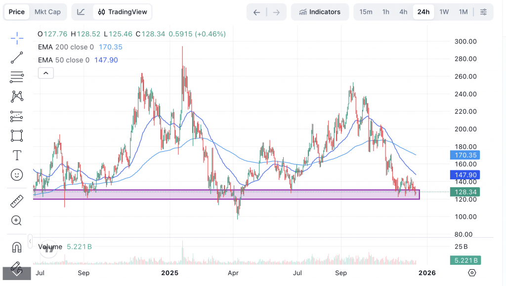 Ein Blick auf den Chart zeigt, dass der aktuelle Kursbereich einer der wichtigsten für Solana ist. Zwischen 120 und 130 Dollar hat sich bei Solana in den letzten Wochen eine Unterstützungszone gebildet. Diese Zone hat nicht nur in den letzten Wochen mehrfach gehalten, sondern auch in früheren Abwärtsphasen des Jahres als verlässlicher Boden fungiert. Der Kurs bewegt sich derzeit innerhalb dieser Spanne, was für viele Marktteilnehmer ein Zeichen dafür ist, dass sich hier eine Bodenbildung abzeichnen könnte.