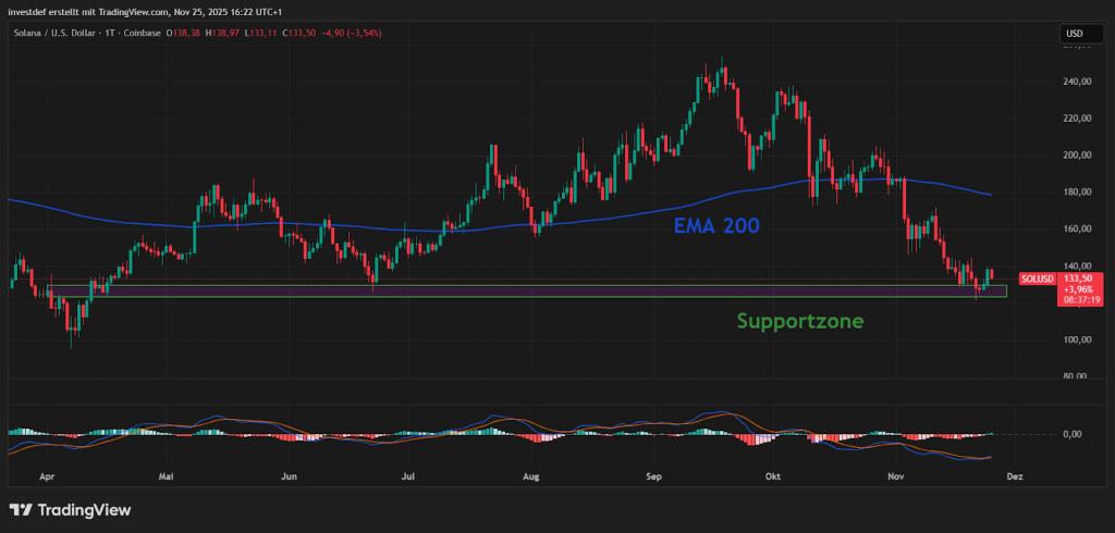 Solana weist also eine sogenannte relative Schwäche im Vergleich zu Bitcoin auf. Dieses Bild hat sich auch in den vergangenen Wochen kontinuierlich fortgesetzt. Das hat dazu geführt, dass der Kurs von Solana innerhalb weniger Wochen nicht nur um 40 Prozent gefallen ist, sondern dabei auch mehrere bedeutende Supportzonen durchbrochen hat. Darunter fällt auch der EMA 200, was ein sehr bearishes Signal ist.
