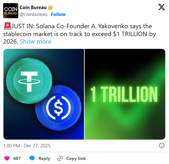Laut einem neuen Statement erklärte Anatoly Yakovenko, Mitgründer von Solana, dass der Stablecoin-Markt bis 2026 die Marke von 1 Billion US-Dollar überschreiten könnte. Diese Aussage ist mehr als bloße Spekulation: Bereits heute liegt die Marktkapitalisierung von Stablecoins bei mehreren hundert Milliarden Dollar. Treiber sind vor allem der steigende Einsatz im internationalen Zahlungsverkehr, im DeFi-Sektor sowie als digitales Pendant zum US-Dollar in Schwellenländern.