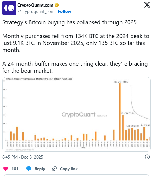 Laut neuester Daten von CryptoQuant sind die Bitcoin-Käufe des Unternehmens Strategy im Jahr 2025 dramatisch eingebrochen. Während im Hoch 2024 noch monatlich rund 134.000 BTC zugekauft wurden, lag der Wert im November 2025 nur noch bei 9.100 BTC und im laufenden Monat wurden bisher gerade einmal etwa 135 BTC erworben. Diese Entwicklung deutet deutlich darauf hin, dass Strategy seine aggressive Akkumulationsstrategie dramatisch zurückgefahren hat.