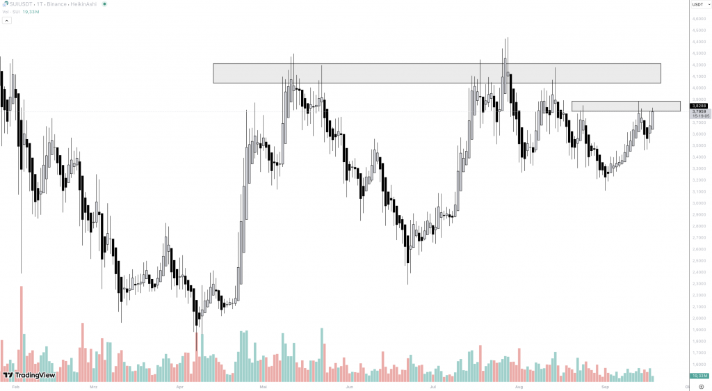 Kurzfristig zeigt sich der Chart von SUI deutlich verbessert. Bullische Candlesticks deuten auf steigendes Momentum hin, auch wenn das Handelsvolumen die Bewegung bislang nur eingeschränkt bestätigt. Ein Ausbruch über die jüngsten Verlaufshochs bei 3,88 US-Dollar wäre ein erstes starkes Signal. Anschließend müssten die Bullen genügend Kraft aufbringen, um den Widerstand bei 4,20 US-Dollar zu überwinden. Gelingt dies, könnte sich der Weg für eine dynamische Aufwärtsbewegung öffnen.