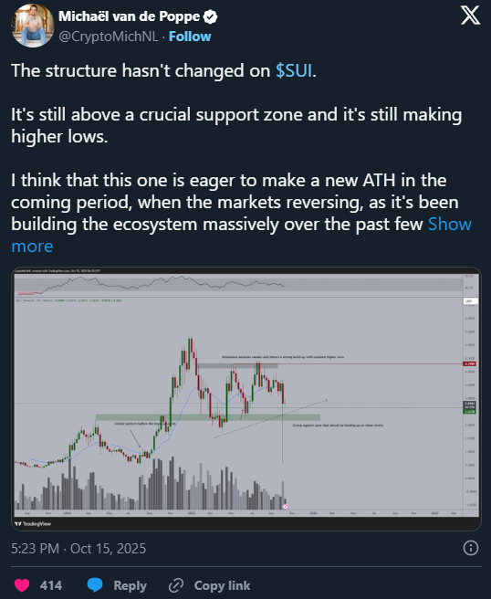 Analyst Michaël van de Poppe hält SUI für einen der vielversprechendsten Altcoins. In einem jüngsten X-Post betonte er, dass SUI nach wie vor über wichtigen Supportzonen bei 2$ und 2,60$ gehandelt wird und zuletzt kontinuierlich Higher Lows gesetzt wurden.