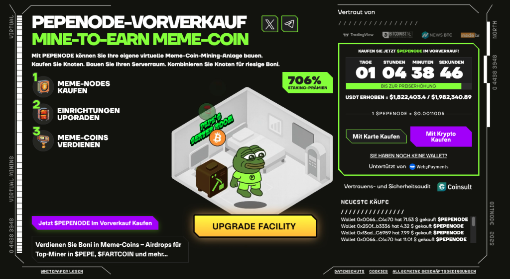 Der Coin selbst befindet sich aktuell noch in der Presale-Phase. Das bedeutet, dass er noch nicht an Krypto-Börsen gelistet ist, sondern nur über die offizielle Website von PEPENODE gekauft werden kann. Hier werden die Coins derzeit zu einem Kurs von 0,0011005 $ verkauft, und es kamen bereits über 1,8 Millionen $ an Presale-Funding von interessierten Investoren zusammen.