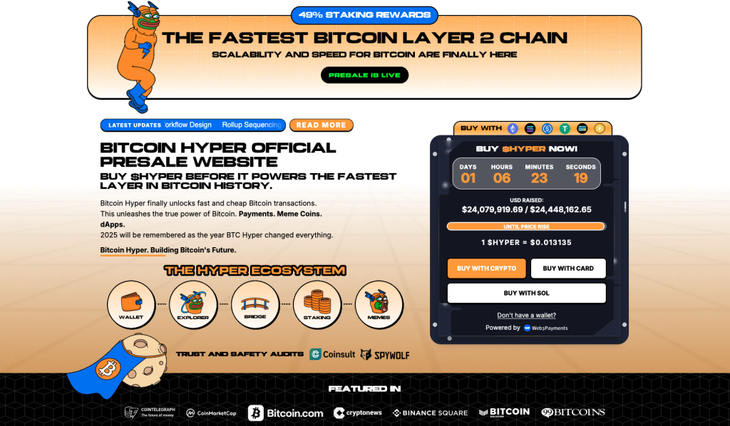 Hier findet man ein Presale-Widget, über das sowohl mit Bankkarte als auch mit etablierten Kryptowährungen investiert werden kann. Die bisherige Presale-Funding-Summe liegt schon deutlich höher als bei SNORT. Stand jetzt belaufen sich die Presale-Investitionen interessierter Anleger auf 24 Millionen $. Das macht Bitcoin Hyper zu einem der erfolgreichsten Presale-Projekte des Jahres, und das, obwohl das Ende des Vorverkaufs noch gar nicht angekündigt wurde.