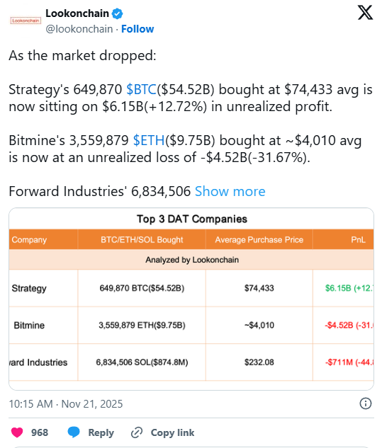 Ganz anders stellt sich die Situation bei Bitmine und Forward Industries dar. Bitmine hat über 3,5 Millionen Ether zu einem Niveau von rund 4.000 Dollar pro Coin akkumuliert und liegt nun mit mehr als vier Milliarden Dollar im negativen Bereich. Noch stärker unter Druck steht Forward Industries, das auf Solana gesetzt hat und mehr als 6,8 Millionen SOL zu durchschnittlich 232 Dollar kaufte. Der Kursrutsch hat diese Position mit einem unrealisierten Verlust von rund 711 Millionen Dollar tief ins Minus gedrückt.