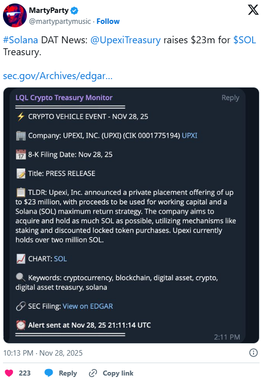 Upexi, eines der führenden Solana-Treasury-Unternehmen in den USA, stärkt seine Kapitalbasis mit einer weiteren Finanzierungsrunde. Laut aktueller SEC-Mitteilung hat die börsennotierte Gesellschaft eine Vereinbarung mit einem institutionellen Investor geschlossen und gibt dabei rund 3,29 Millionen Aktien sowie entsprechende Warrants aus. Bemerkenswert ist die Bewertung: Der Ausgabepreis von 3,04 US-Dollar liegt über dem Marktpreis und entspricht einem 1,3-fachen Aufschlag auf die interne Nettovermögensbewertung. Für die Solana-Treasury-Strategie des Unternehmens gilt der Deal als wertsteigernd, da er die Menge an SOL pro Aktie erhöht.