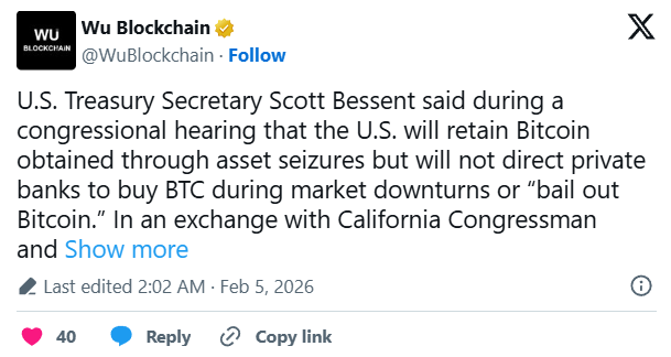 Die Haltung der USA gegenüber Bitcoin bleibt klar positiv, auch ohne aktive Markteingriffe. In einer Kongressanhörung machte US-Finanzminister Scott Bessent deutlich, dass beschlagnahmte Bitcoin-Bestände nicht verkauft werden sollen. Gleichzeitig grenzte er die Rolle des Staates klar ab und wies Spekulationen über staatliche Stützungsmaßnahmen zurück.