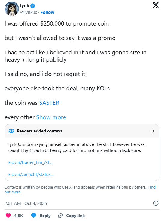 Doch auf X wurden zuletzt mehrere Vorwürfe laut, die das Projekt in ein anderes Licht rücken. Zahlreiche Krypto-Influencer berichteten, dass ihnen hohe Summen, teils im sechsstelligen Bereich, angeboten wurden, um den Token zu bewerben, ohne dies als bezahlte Werbung zu kennzeichnen. Noch schwerer wiegt, dass diese Vergütungen häufig in $ASTER selbst erfolgten, was die Gefahr von Dumpingaktionen nach künstlichem Hype stark erhöht.