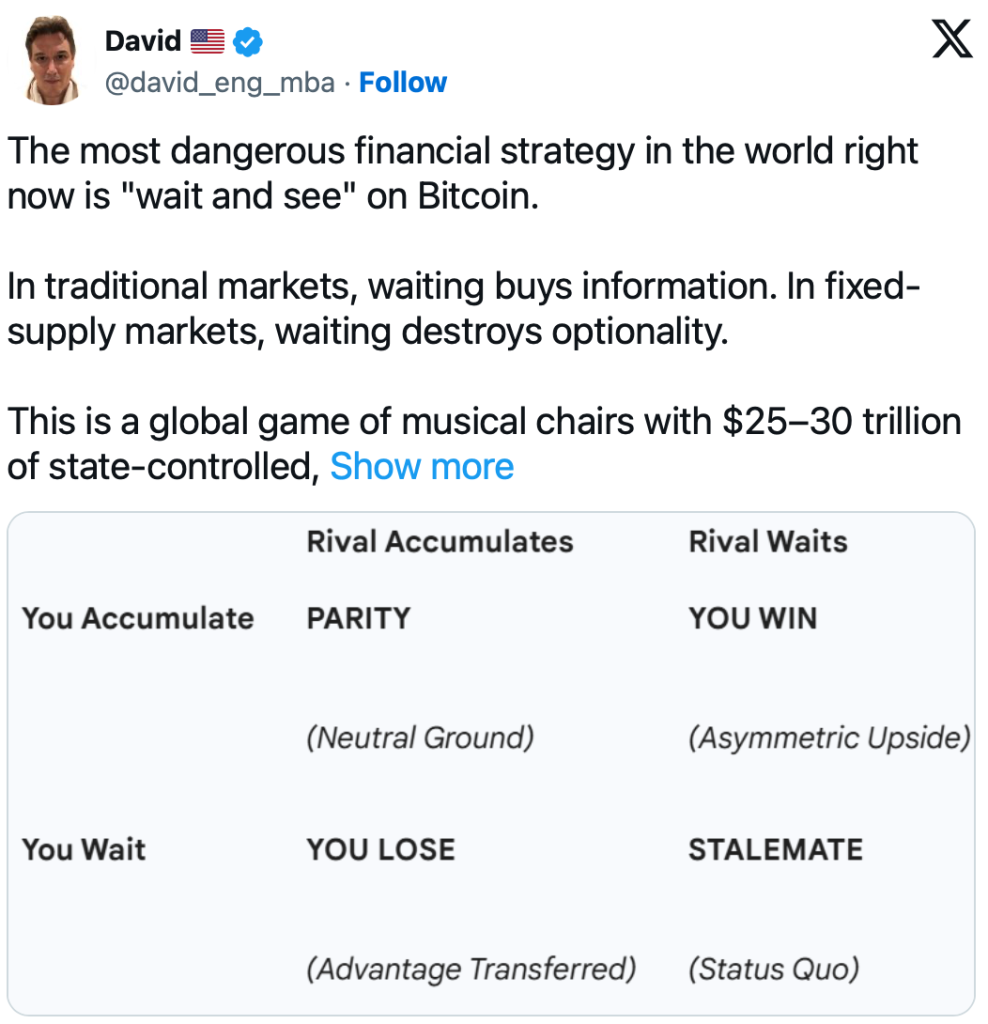 In den traditionellen Finanzmärkten gilt Abwarten häufig als vernünftige Strategie, um mehr Informationen zu sammeln. Im Bitcoin-Markt kehrt sich diese Logik jedoch um: Analysten warnen, dass langes Zögern aktuell eine der größten Gefahren für Anleger darstellt. Bitcoin unterscheidet sich durch sein festes Angebot von 21 Millionen Einheiten grundlegend von anderen Assets. Große Kapitalzuflüsse führen hier nicht zu langsamer Absorption, sondern zu raschen Neubewertungen. Wer zu lange wartet, riskiert, dass institutionelle und staatliche Akteure den verfügbaren Vorrat bereits stark reduzieren.