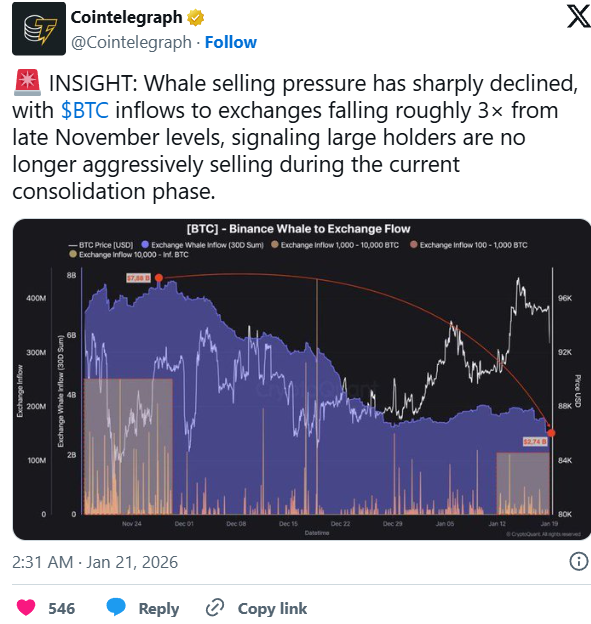 On-Chain-Daten zeigen, dass die Zuflüsse von Bitcoin an Börsen zuletzt deutlich gesunken sind. Da Einzahlungen auf Handelsplattformen häufig mit Verkaufsabsichten verbunden sind, gilt dieser Rückgang als Hinweis auf nachlassenden Verkaufsdruck durch große Marktteilnehmer. Im Vergleich zu Ende November liegen diese Zuflüsse aktuell etwa dreimal niedriger.