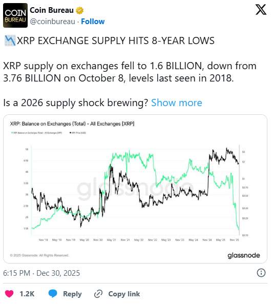 Ein entscheidender Vorteil des Kryptomarkts liegt in seiner Transparenz. On-Chain-Daten erlauben es, Angebot und Nachfrage nahezu in Echtzeit zu verfolgen. Aktuelle Auswertungen zeigen, dass bald keine XRP mehr auf zentralisierten Börsen verfügbar sein wird. Laut jüngsten Analysen ist der verfügbare Bestand inzwischen auf ein Niveau gefallen, das zuletzt vor rund acht Jahren erreicht wurde.
