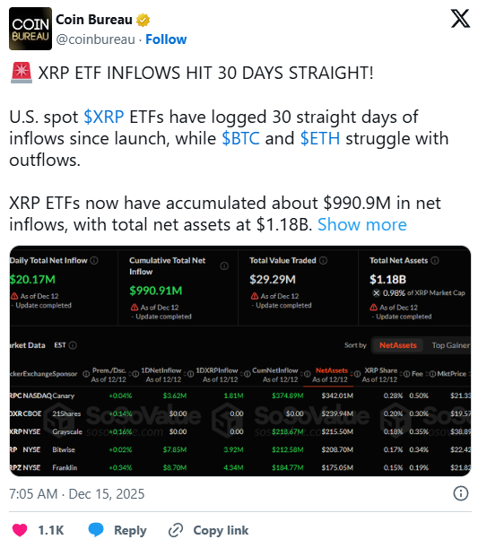 Der Vergleich zu den Solana-ETFs, die ebenfalls erst seit kurzem handelbar sind, fällt eindeutig zugunsten von XRP aus. Während sich die Solana ETFs zwar ebenfalls großer Beliebtheit unter Anlegern erfreuen, ist es hier seit der Markteinführung bereits mehrmals zu Kapitalabflüssen gekommen. Die Daten von Coinglass zeigen, dass Solana am 12. Dezember 2025 zwar mit 397.170K den höchsten Nettozufluss verzeichnete, es jedoch auch mehrere Tage mit deutlichen Abflüssen gab.