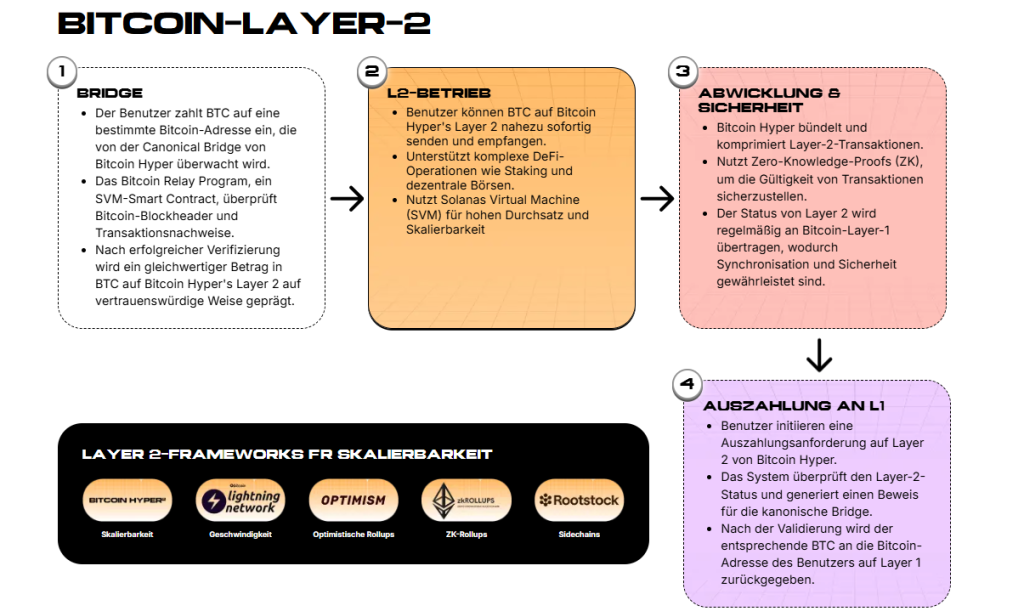 Das Ziel ist klar: Bitcoin soll durch Hyper nicht nur als Wertaufbewahrungsmittel dienen, sondern auch für Transaktionen und Anwendungen nutzbar werden. Herzstück des Systems ist eine Brücke, die Bitcoin auf der Hauptchain sichert und in Form eines abgebildeten Tokens innerhalb des Hyper-Netzwerks verfügbar macht. Diese Lösung ermöglicht blitzschnelle Transaktionen, ohne auf die Sicherheit der Bitcoin-Blockchain zu verzichten.