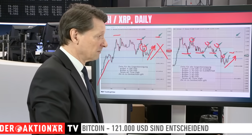 Auch Tokentus-Chef Oliver Michel sieht in seiner Chartanalyse eine ähnliche Struktur. Nach dem Flash Crash habe XRP eine stabile Gegenbewegung gezeigt, doch die Marke von 2,70 sei nun entscheidend. Sie hatte in der Vergangenheit mehrfach als Unterstützung gedient und könnte nun als Widerstand wirken. Ein Durchbruch darüber wäre ein erster Befreiungsschlag, so Michel. Danach rücken 3,10, 3,20 und 3,40 ins Visier, bevor überhaupt an neue Allzeithochs zu denken ist.