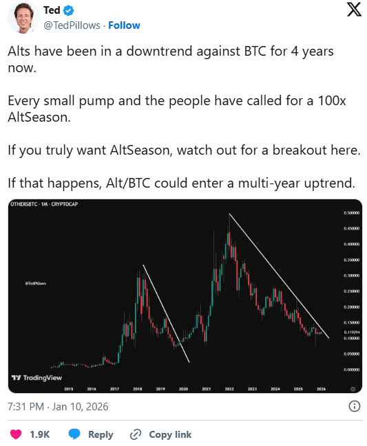 Seit dem Ende des letzten großen Bullenmarktes hat sich ein klarer Trend etabliert. Während Bitcoin sein Hoch aus dem Jahr 2021 bereits deutlich überschritten hat, ist dies den meisten Altcoins nicht gelungen. In der relativen Betrachtung gegenüber Bitcoin befinden sich große Teile des Altcoin-Marktes seit mehreren Jahren in einem anhaltenden Abwärtstrend. Eine klassische Altcoin Season, in der Altcoins den Marktführer breit outperformen, blieb seitdem aus.