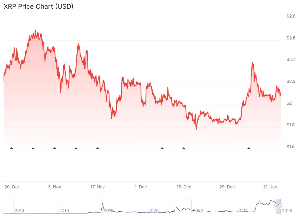 Trotz des starken regulatorischen Rückenwinds konnte XRP kurzfristig nicht profitieren. Der Kurs verzeichnete zuletzt ein Minus von 2,3 % auf 2,12 US-Dollar, nachdem mehrere Versuche gescheitert waren, den Widerstand im Bereich zwischen 2,17 und 2,22 US-Dollar zu überwinden.