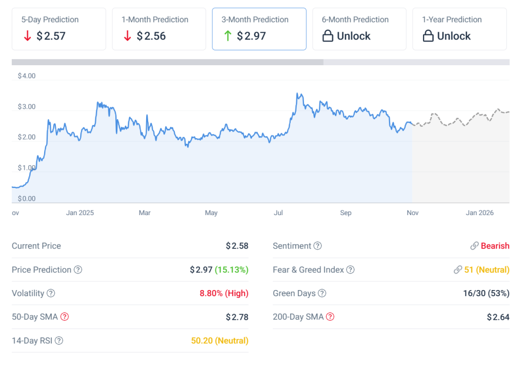 Seit dem Flash-Crash Anfang Oktober schwankt der Kurs in einer engen Spanne zwischen 2,50 und 2,70 US-Dollar. Solange dieser Bereich hält, bleibt das Szenario eines Ausbruchs nach oben intakt. Erst oberhalb von 2,80 bis 3,00 US-Dollar wäre der Weg frei für eine Bewegung in Richtung 4 bis 5 US-Dollar. Unterstützungen liegen bei 2,55 und 2,40 US-Dollar, beide Zonen wurden in den letzten Wochen mehrfach verteidigt.
