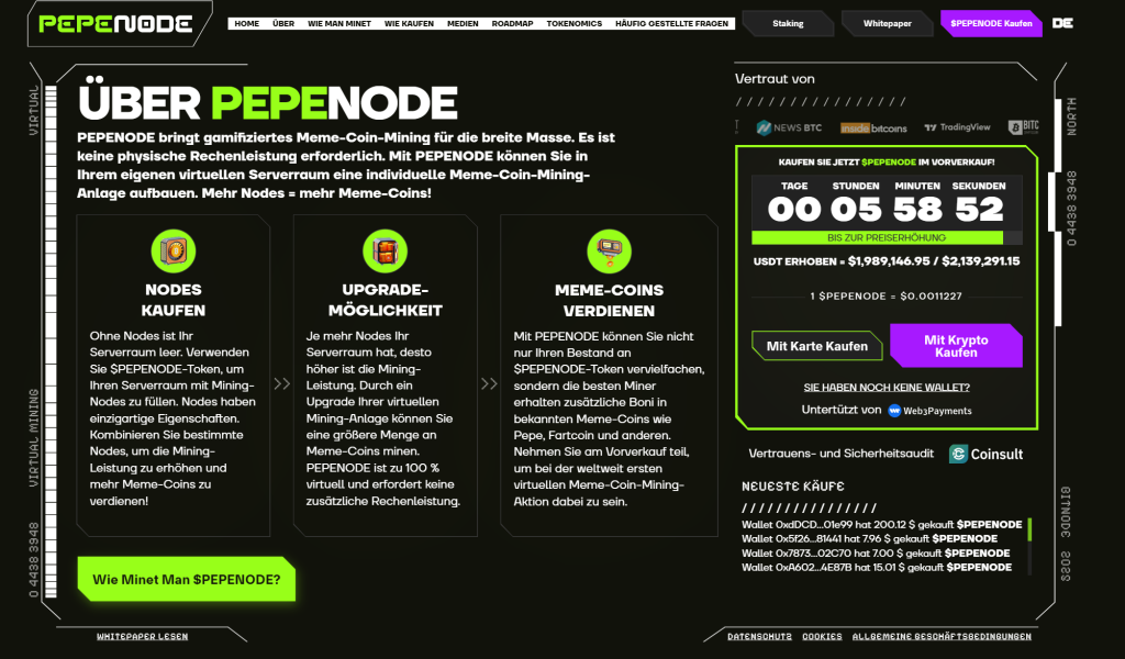 Während XRP zwischen Widerständen festhängt, entsteht im GameFi-Sektor neuer Hype. Das Projekt PepeNode ($PEPENODE) hat kurz vor Ende seiner laufenden Presale-Phase bereits knapp 2 Millionen US-Dollar eingesammelt. Der Tokenpreis liegt derzeit bei 0,0011227 US-Dollar, bevor in Kürze die nächste Runde mit höherem Preis startet.