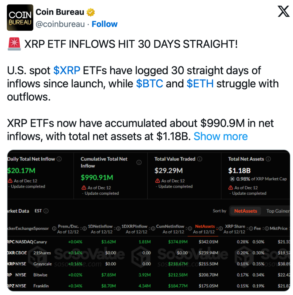 Seit der Einführung von Krypto-ETFs gelten diese Produkte als wichtiger Indikator für das institutionelle Interesse. Während bei Bitcoin- und Ethereum-ETFs zuletzt wiederholt Kapitalabflüsse zu beobachten waren, zeigt sich bei XRP ein anderes Bild. Seit dem Handelsstart verzeichnen XRP-ETFs durchgehend Nettozuflüsse, was auf eine stabilere Nachfrage hindeutet.
