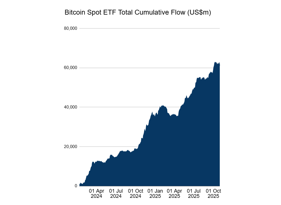 Die Spot ETFs sind immer nooch in der Region des Hochpunkts, Quelle: https://farside.co.uk/btc/