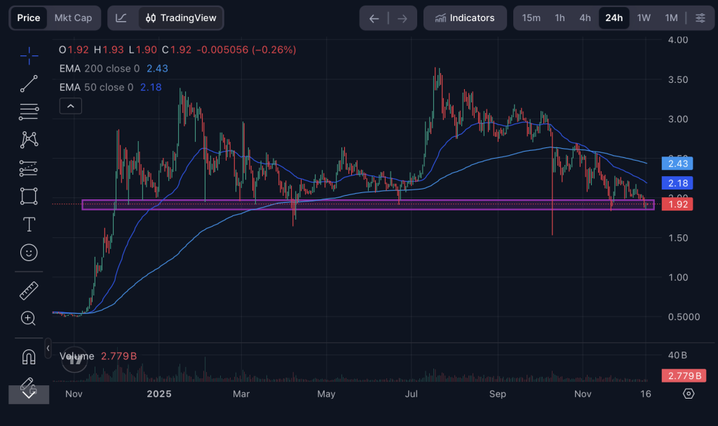 Gleichzeitig zeigt der Blick auf frühere Kursverläufe eine zentrale Unterstützungszone zwischen etwa 1,85 und 2,00 US-Dollar. In diesem Bereich konnte XRP in der Vergangenheit mehrfach nach oben drehen, da Käufer hier wieder verstärkt eingestiegen sind. Aktuell bewegt sich der Kurs genau auf das untere Ende dieser Zone zu. Hält dieser Support, wäre zumindest eine technische Erholung denkbar.