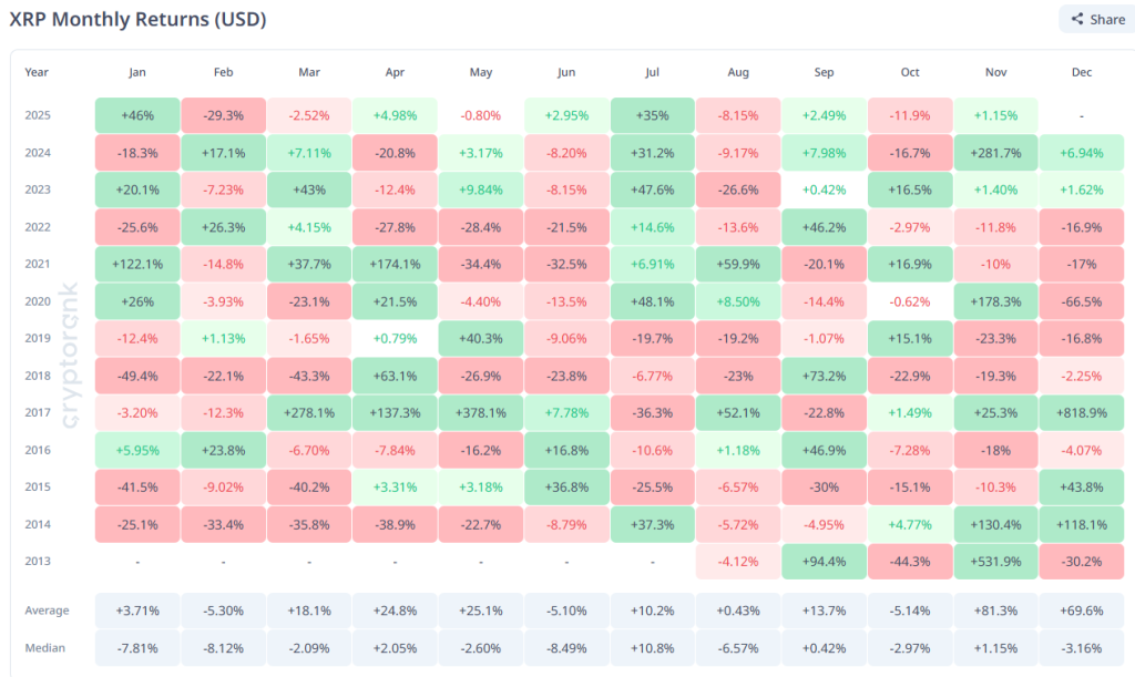 Der Oktober war für XRP kein leichter Monat. Der Token verlor über zwölf Prozent an Wert, ähnlich wie im Oktober 2024. Mit dem Start in den November fragen sich Trader nun, ob XRP an seine historische Performance anknüpfen kann, als er im letzten Jahr um mehr als 280 Prozent gestiegen war. Selbst ein Bruchteil davon würde vielen Anlegern reichen, um wieder optimistischer in den Monat zu gehen.