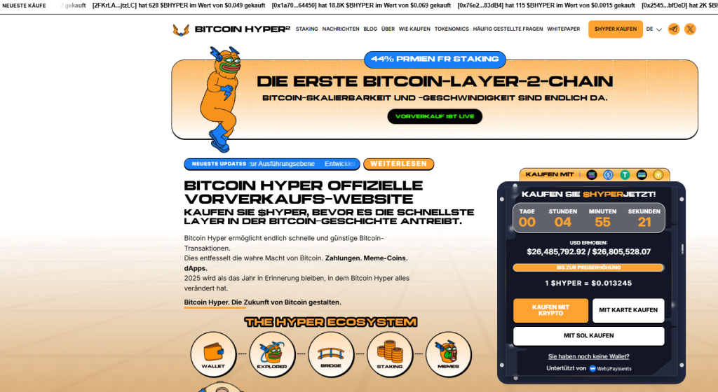 Während XRP seine Marktstellung im globalen Zahlungsverkehr festigt, entsteht mit Bitcoin Hyper ein Projekt, das technologisch in eine ähnliche Richtung zielt, jedoch auf Basis einer völlig neuen Architektur. Bitcoin Hyper kombiniert die Geschwindigkeit der Solana Virtual Machine mit der Sicherheit des Bitcoin Netzwerks und schafft so eine Layer 2 Struktur, die blitzschnelle Transaktionen mit der Stabilität einer etablierten Blockchain verbindet.