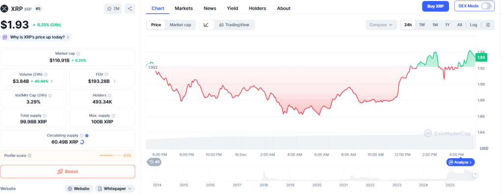 Während große Teile des Kryptomarkts weiter unter Druck stehen, setzt XRP ein erstes Ausrufezeichen. In den vergangenen 24 Stunden legte der Kurs um 0,95 Prozent auf 1,94 US-Dollar zu. Das sticht heraus, denn auf Sicht von 7 Tagen steht weiterhin ein Minus von 8,3 Prozent, auf 30 Tage sogar von 11,2 Prozent. Genau diese Divergenz sorgt aktuell für viel Aufmerksamkeit. XRP entkoppelt sich kurzfristig vom übergeordneten Abwärtstrend und zieht Käufer an, obwohl die Marktstimmung insgesamt angespannt bleibt.
