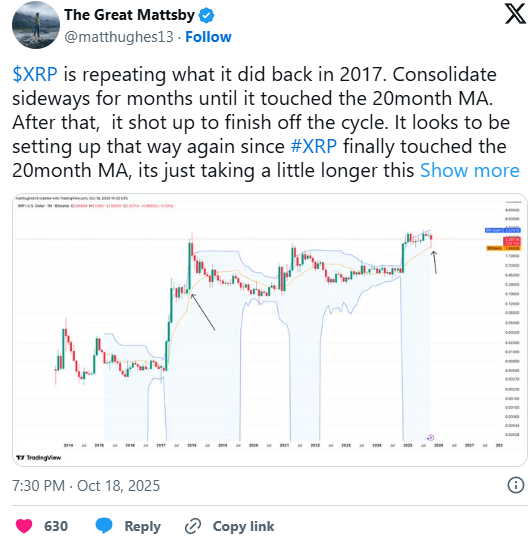 Der technische Analyst The Great Mattsby erkennt bei XRP eine auffällige Parallele zum Kursverlauf von 2017. Damals bewegte sich der Coin über mehrere Monate seitwärts, bis der Kurs im Monatschart die 20-Monats-Durchschnittslinie erreichte. Genau dieser technische Punkt markierte damals den Beginn einer explosiven Aufwärtsbewegung, die in einer stark bullischen Jahreskerze mündete.