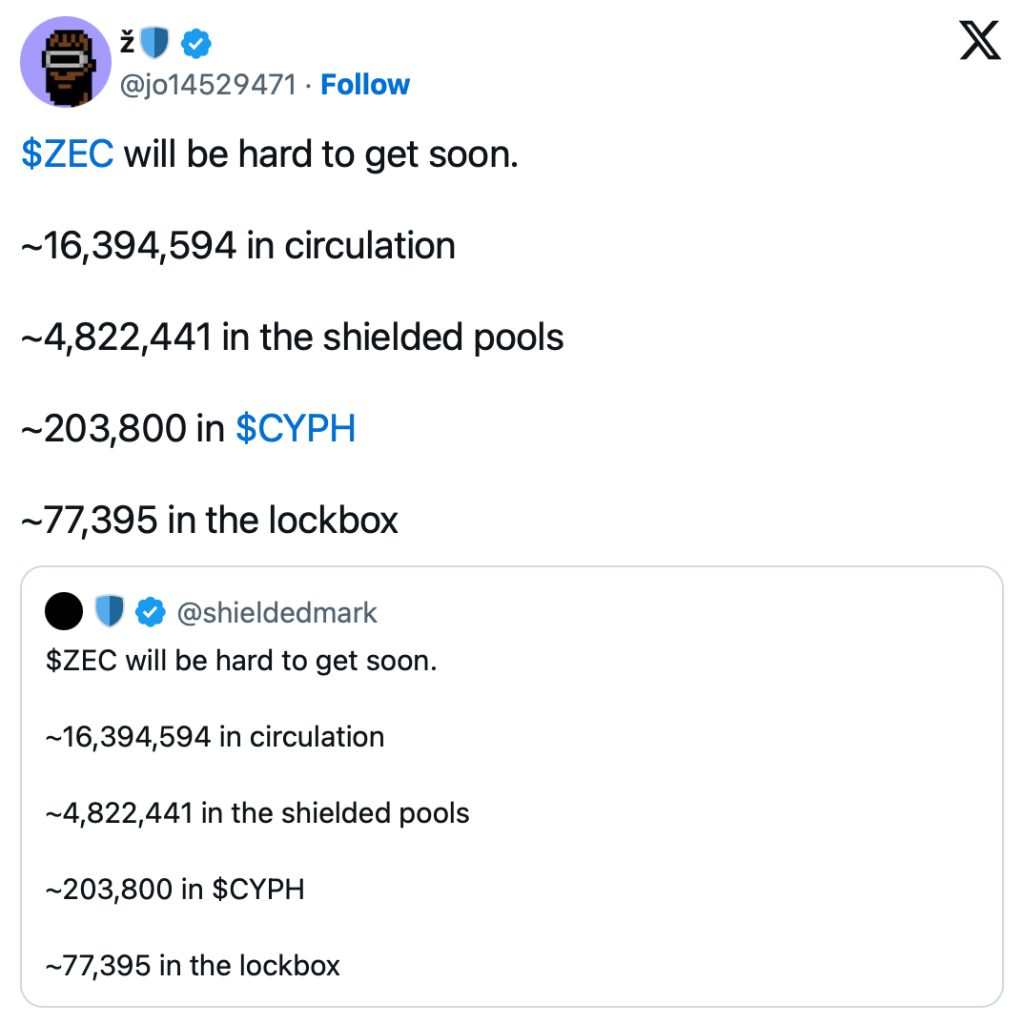 Auch auf der Angebotsseite zeigt ZEC ein Setup, das Experten als extrem bullisch einstufen. Von den 16,39 Millionen Coins im Umlauf befinden sich große Teile in Shielded Pools oder sind dauerhaft in Projekten wie Lockbox oder CYPH gebunden. Die frei handelbare Menge schrumpft dadurch erheblich – eine klassische Konstellation für explosive Preisbewegungen.