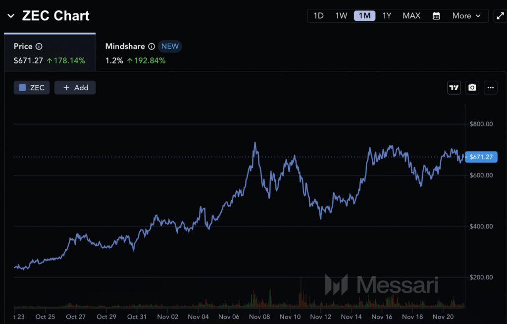 Zcash legte innerhalb von vier Wochen um rund 180 Prozent zu, wobei Messari für Mindshare sogar eine Wertsteigerung von 192 Prozent meldet. Zu den spannendsten Faktoren zählt die Entscheidung von Cypherpunk Technologies, dem neu positionierten DAT-Vehikel der Winklevoss-Zwillinge vom 12. November, erhebliche ZEC-Bestände aufzubauen. Parallel dazu verstärkte Binance das institutionelle Interesse, indem ein ZEC/USDC-Perpetual-Kontrakt mit einem Hebel von bis zu 75x eingeführt wurde.